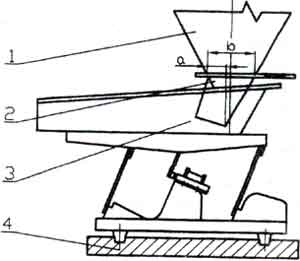 ??電磁振動給料機的振幅和給料量受料倉倉壓影響較大,設(shè)計料倉時應(yīng)盡量減少倉壓,使溜咀后側(cè)板承受一定的倉壓,并設(shè)置斜溜沮及下料閘門。如圖,一般a=1/4b。溜咀四周應(yīng)與給料槽留有一定的間隙,一般5~10mm,以免產(chǎn)生噪音及影響振動。