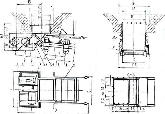 ??1、減速機(jī) 2、電動(dòng)機(jī) 3、傳動(dòng)平臺 4、聯(lián)軸器 5、H形架 6、連桿 7、給煤槽 8、閘門 9、機(jī)架 10、漏斗 11、托輥